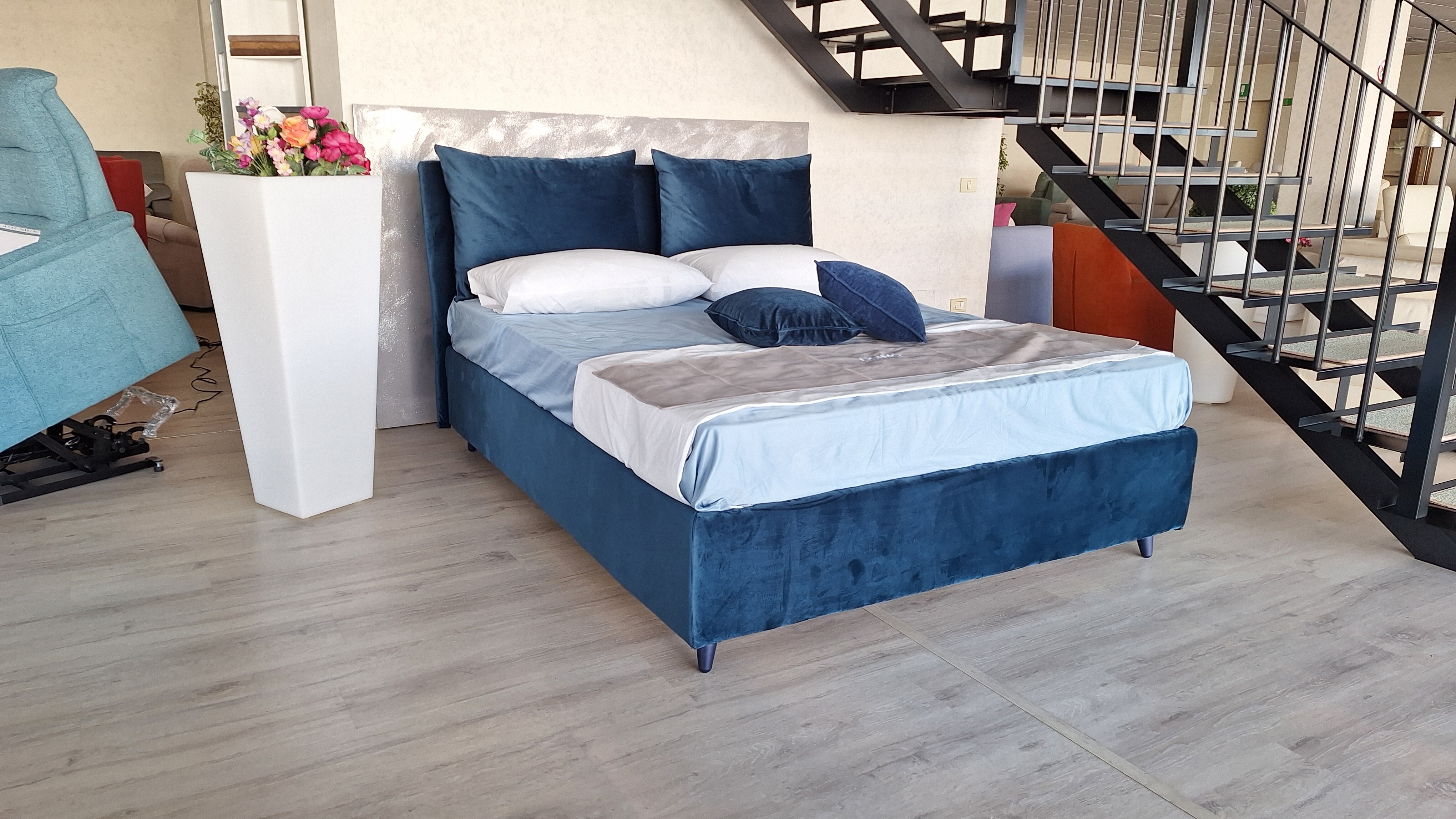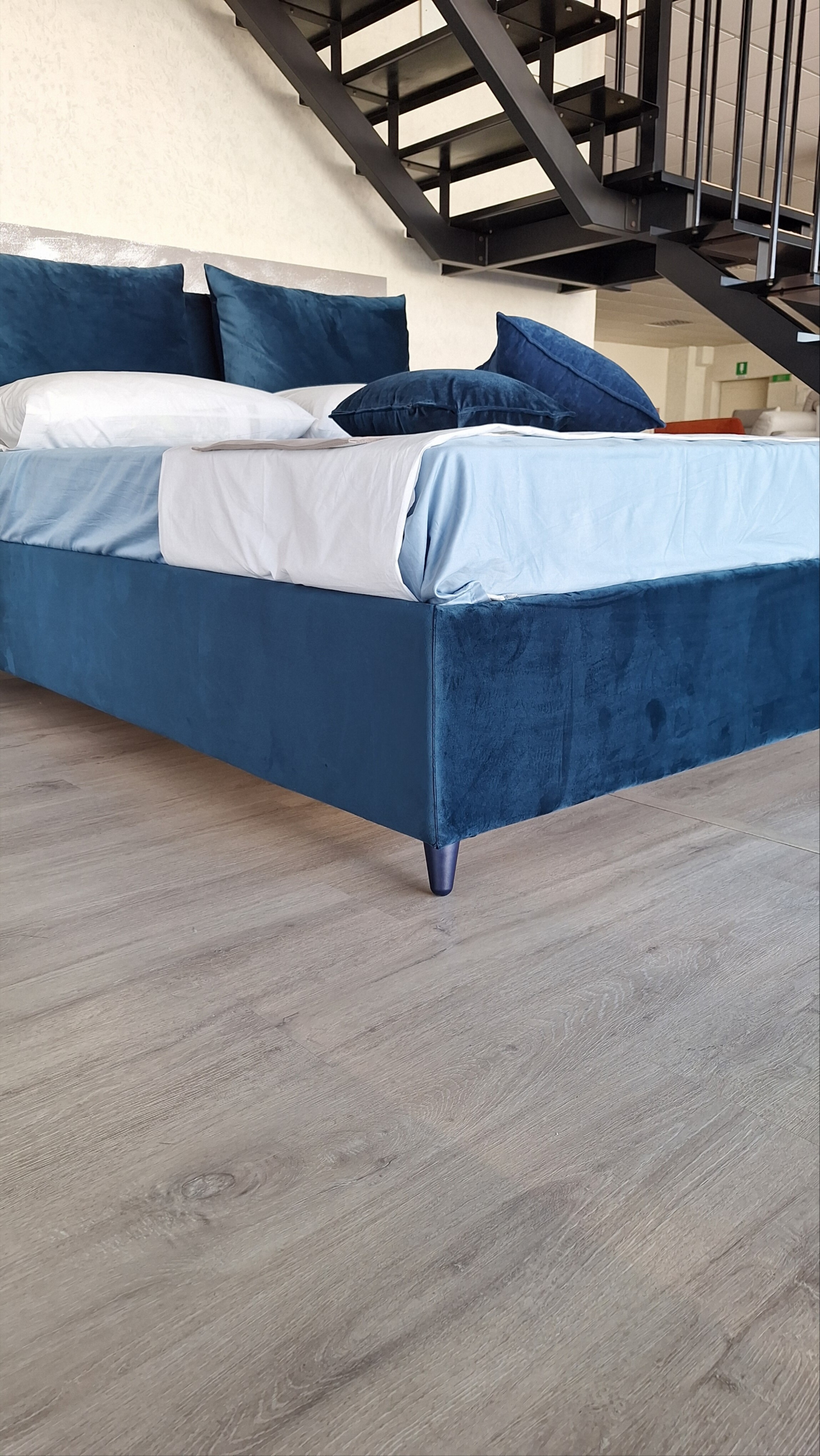 Letto con con rete e contenitore in velluto colore blu, piede alto.